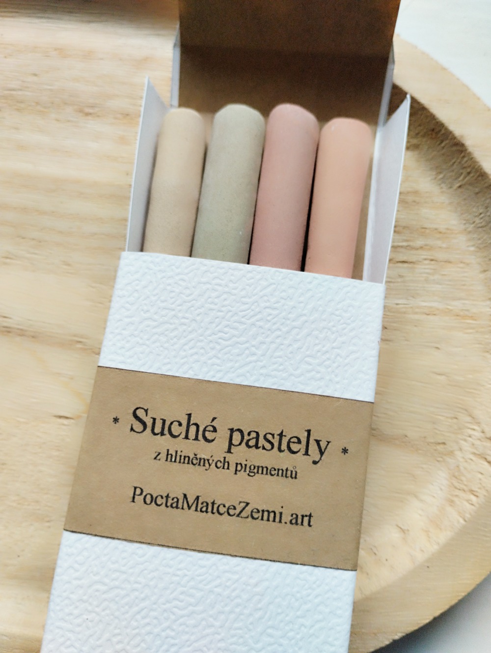 Sada obsahuje čtyři kusy pastelů v papírové krabičce o rozměrech 50 x 80 x 15 mm.
