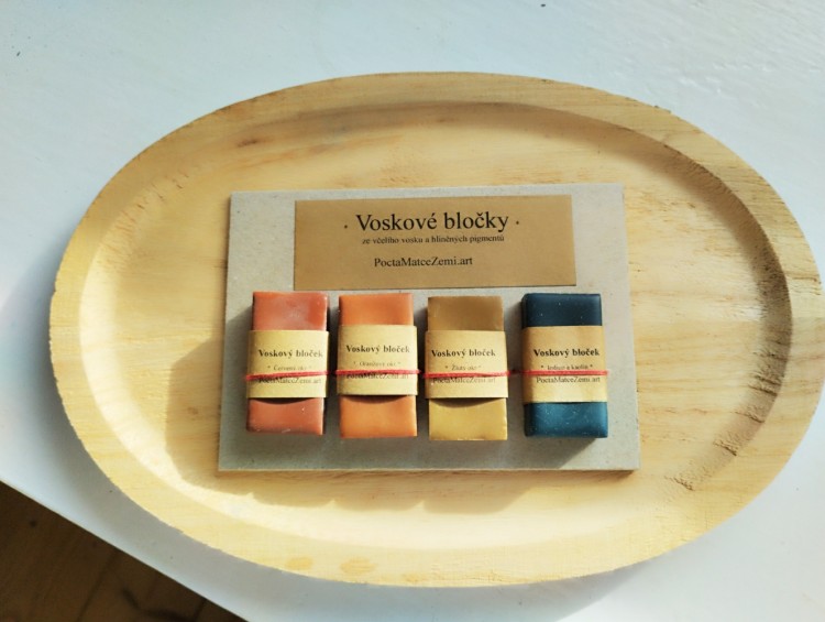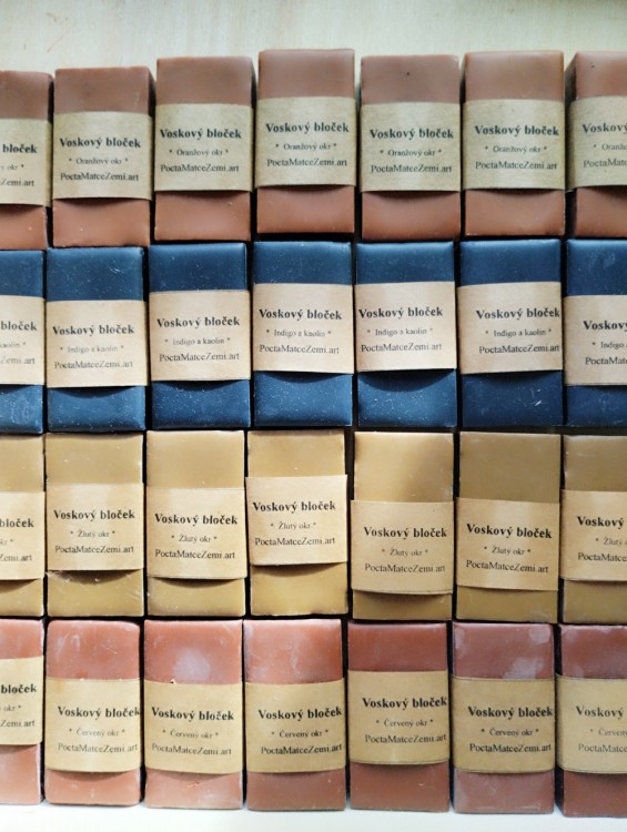 Složení: včelí vosk, sójový vosk, hliněné pigmenty a indigo.